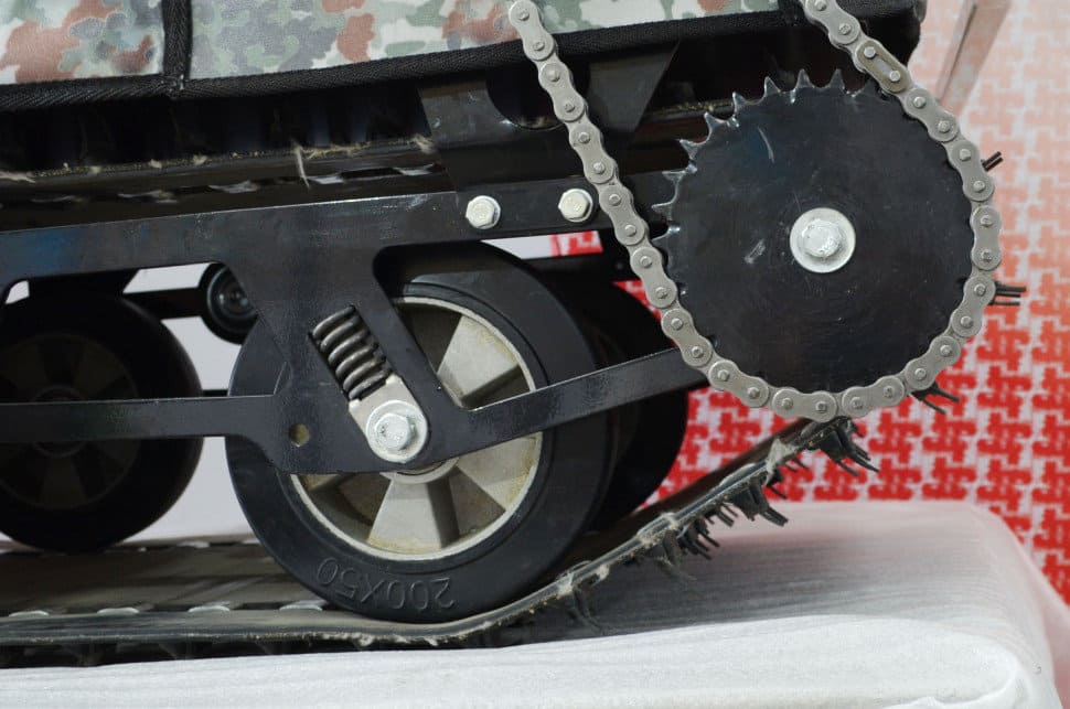 Мотособака весит 115 кг, а размер ее составляет 145 см в длину, 58 см в ширину и 84 см в высоту. Благодаря своей легкости и компактности, мотобуксировщик способен маневрировать и проходить по рыхлой и мягкой почве. К тому же мотобукс оснащен катковой подвеской, которая сглаживает ход, обеспечивает устойчивость на неровной поверхности, смягчает удары и вибрации от дороги.