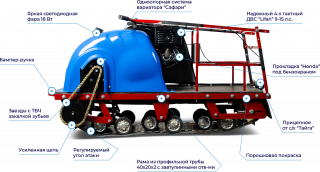 Мотособака весит 110 кг, а размер ее составляет 175 см в длину, 59 см в ширину и 78 см в высоту. Благодаря своей легкости и компактности, мотобуксировщик может маневрировать и проходить по рыхлой и мягкой почве. Кроме того, у мотобукса есть катковая подвеска, которая улучшает ход, обеспечивает устойчивость на неровной поверхности, а также смягчает удары и вибрации от дороги.