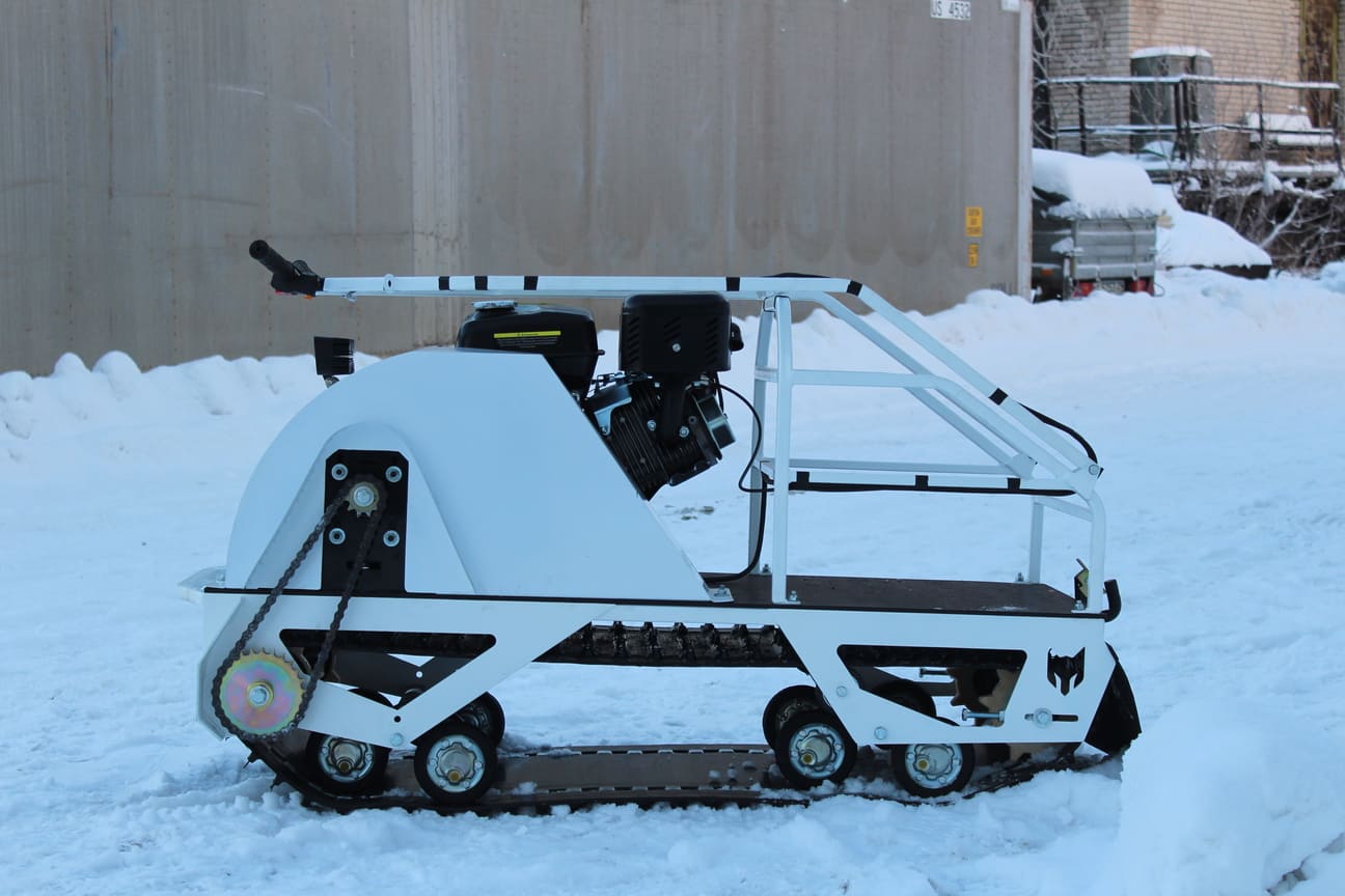 Мотособака весит 85 кг, а размер ее составляет 355 см в длину, 55 см в ширину и 85 см в высоту. Благодаря своей легкости, мотобуксировщик может маневрировать и проходить по рыхлой и мягкой почве. Кроме того, у мотобукса есть катковая подвеска, которая улучшает ход, обеспечивает устойчивость на неровной поверхности, а также смягчает удары и вибрации от дороги.