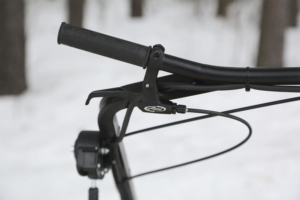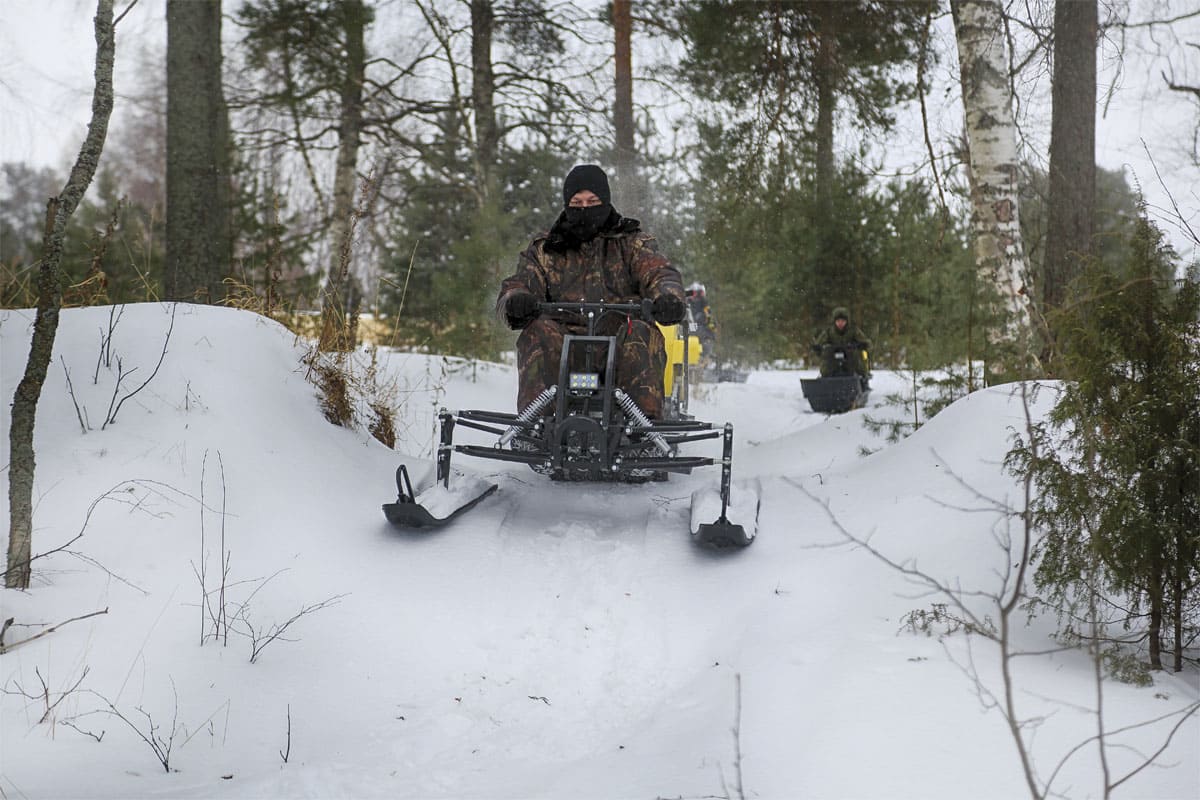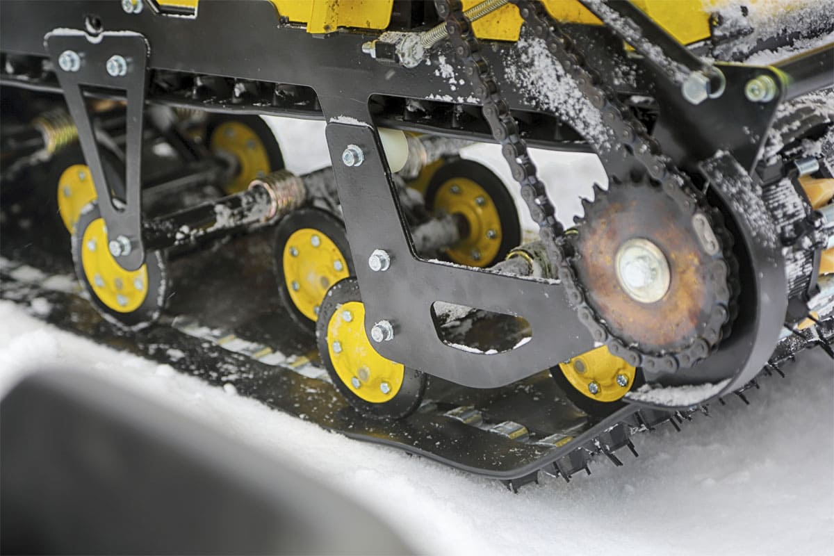 В конструкции мотовездехода используется цельная резиновая гусеница шириной 500 мм. Гусеница в сочетании с катковой подвеской способна проходить спокойно по льду и даже по территории без снега.