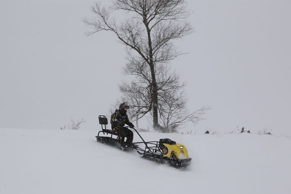 Буксировщик оснащен 4-х тактным двигателем мощностью 17 л. с., достигающий скорость до 40 км/ч. Это позволяет быстро перевозить груз до 300 кг в санях и на специальной багажной площадке мотобуксировщика. Объем двигателя составляет 459 кубов.