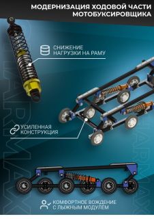 Конструкция мотобуксировщика Sharmax S5001450 HP15 Ultra устроена таким образом, что позволяет без особого труда устанавливать к ней и использовать любые шасси, предназначенные для различных условий эксплуатации. Универсальные посадочные отверстия основы и кузова мотобуксировщика Sharmax могут использоваться на склизовой, катковой и даже колесной подвеске. Также возможна установка лыжного модуля.
