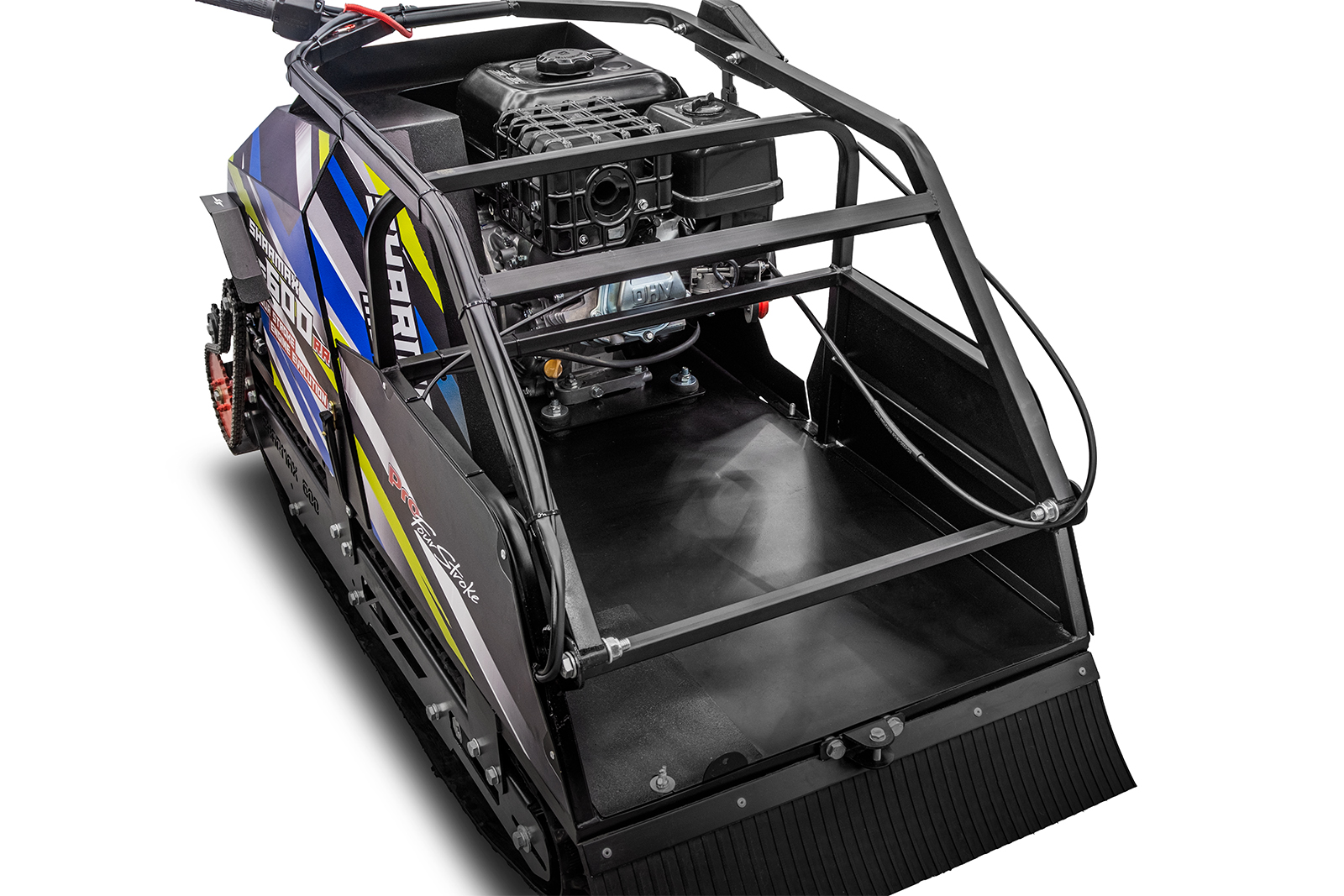 Уникальная конструкция рёбер жёсткости и формы кузова позволила избежать избыточного веса мотобуксировщика, и даже на 7% уменьшить вес среди аналогичных классов моделей других брендов. Теперь сухая массе  Sharmax SE600 составляет всего 115 кг. Данный кузов не абсолютно не имеет аналогов на рынке России.