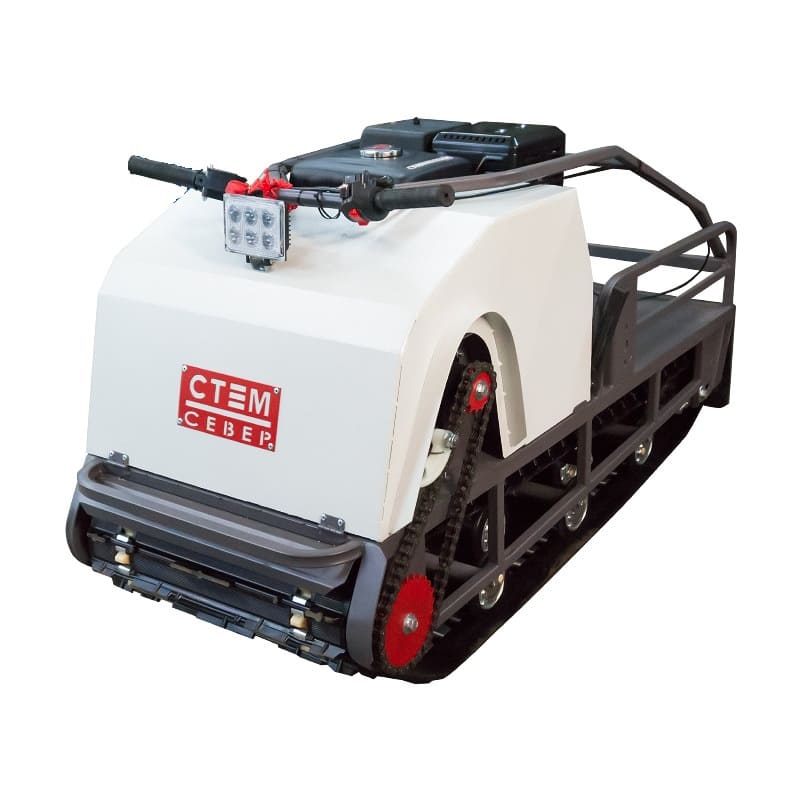В конструкции мотовездехода используется цельная резиновая гусеница шириной 500 мм. Гусеница в сочетании с катковой подвеской способна проходить спокойно по льду и даже по территории без снега.