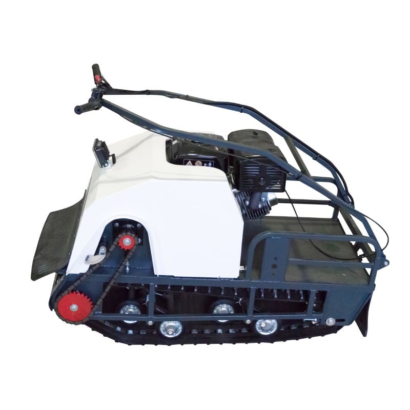 В конструкции мотовездехода используется цельная резиновая гусеница шириной 500 мм. Гусеница в сочетании с катковой подвеской способна проходить спокойно по льду и даже по территории без снега.