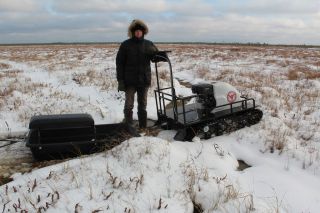 У буксировщика имеется компактная задняя площадка для перевозки личных вещей, инструментов, рыбацких снастей и прочих необходимых мелочей охотнику или рыбаку. Техника оснащена яркой фарой, которая позволяет пользоваться транспортом даже в темное время суток. Морозо- и вибростойкий капот с чехлом карбюратора и пластинами утепления - максимально защищает ДВС от обледенения и от возможности лопнуть.