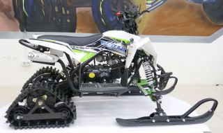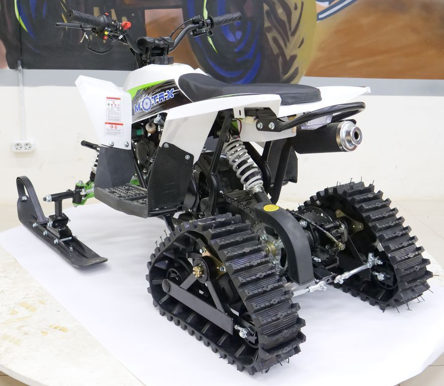 - Детский снегоцикл имеет богатую базовую комплектацию, он оборудован: электрическим стартером, пультом дистанционного глушения и запуска двигателя, механическим ограничителем скорости, дисковым гидравлическим задним тормозом, комфортными гидравлическими амортизаторами с регулировкой преднатяжения пружин, яркой передней фарой и светодиодным задним фонарем с стоп сигналом, вместительным топливным баком объёмом 3.5 литра, усиленной 420 приводной цепью.